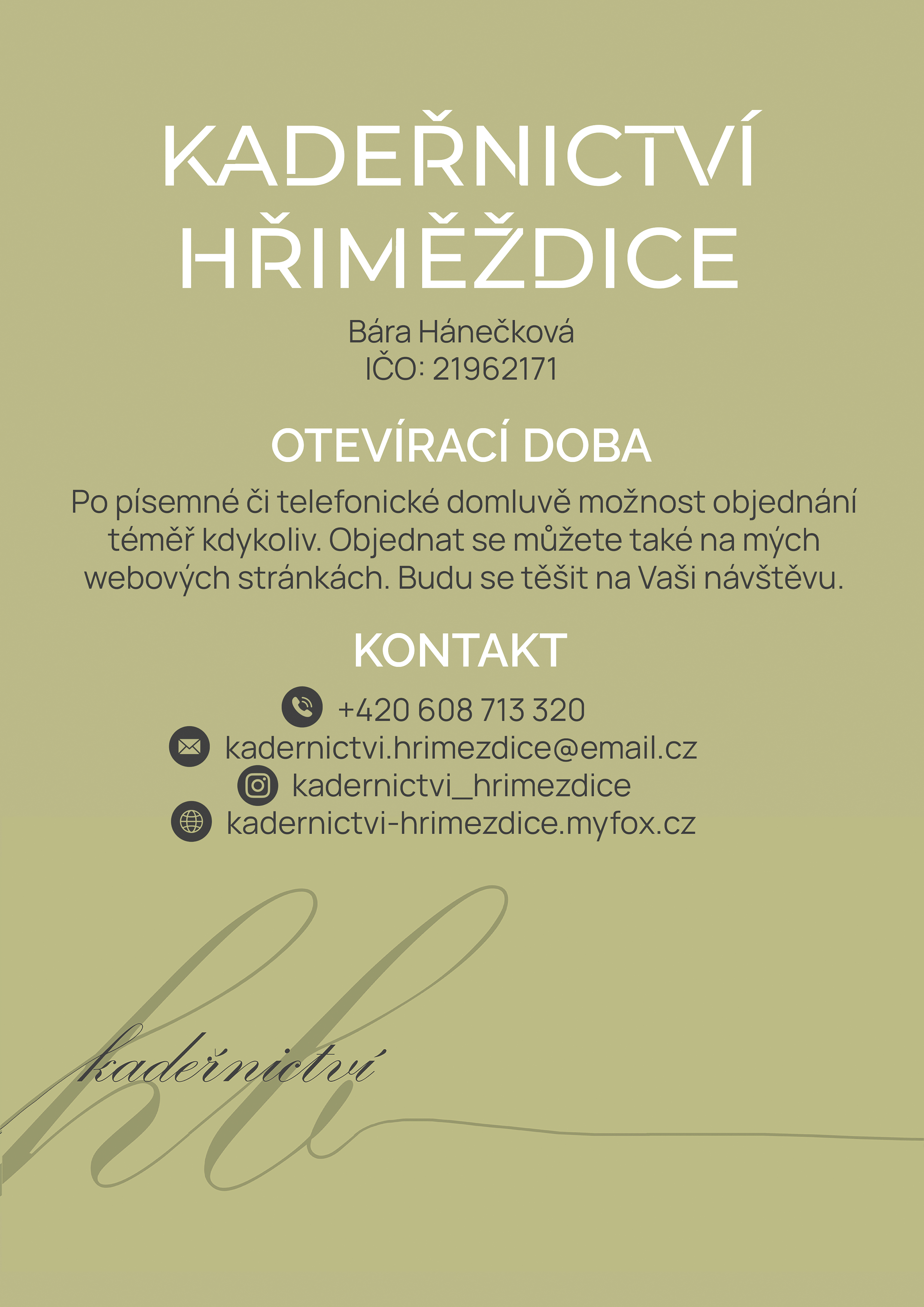 Nově otevřené kadeřnictví v Hřiměždicích čp. 68 čeká na své zákazníky. Chcete objednat? Volejte 608713320. Těší se na Vás Bára Hánečková